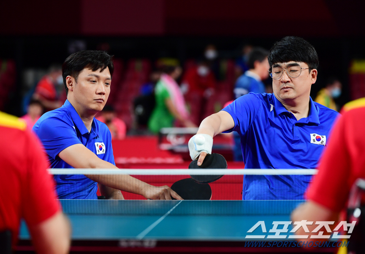 31일 일본 도쿄 메트로폴리탄 체육관에서 열린 2020 도쿄패럴림픽 탁구 남자 단체전(스포츠 등급1-2) 8강전에서 대한민국 박진철(왼쪽)과 차수용이 1복식 대결을 벌이고 있다. 도쿄(일본)=정재근 기자 cjg@sportschosun.com
