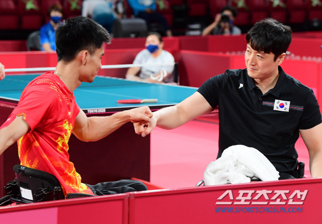 2일 일본 도쿄 메트로폴리탄 체육관에서 열린 2020 도쿄패럴림픽 탁구 남자 단체전(스포츠 등급4-5) 대한민국과 중국의 결승전에서 중국이 2대0으로 승리했다. 2단식에서 대결했던 김정길과 차오닝닝이 경기 후 인사하고 있다. 차오닝닝은 한국 선수 문성혜의 남편이다. 도쿄(일본)=정재근 기자 cjg@sportschosun.com