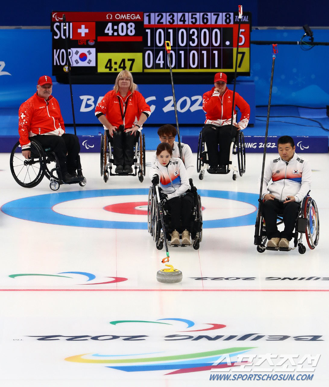 5-5 동점 상황에서 팽팽한 접전이 이어졌다. 한국이 6엔드와 7엔드, 각각 1점씩을 득점하며 앞서 나갔다. 6엔드 고승남이 기막힌 샷을 밀어넣었다. 하우스 정중앙, 버튼 앞에 놓여 있던 상대 1, 2번 스톤을 더블 테이크 아웃하며 득점에 성공했다. 하지만 한국은 8엔드 스위스에 2실점하며 승부는 연장으로 흘러갔다.