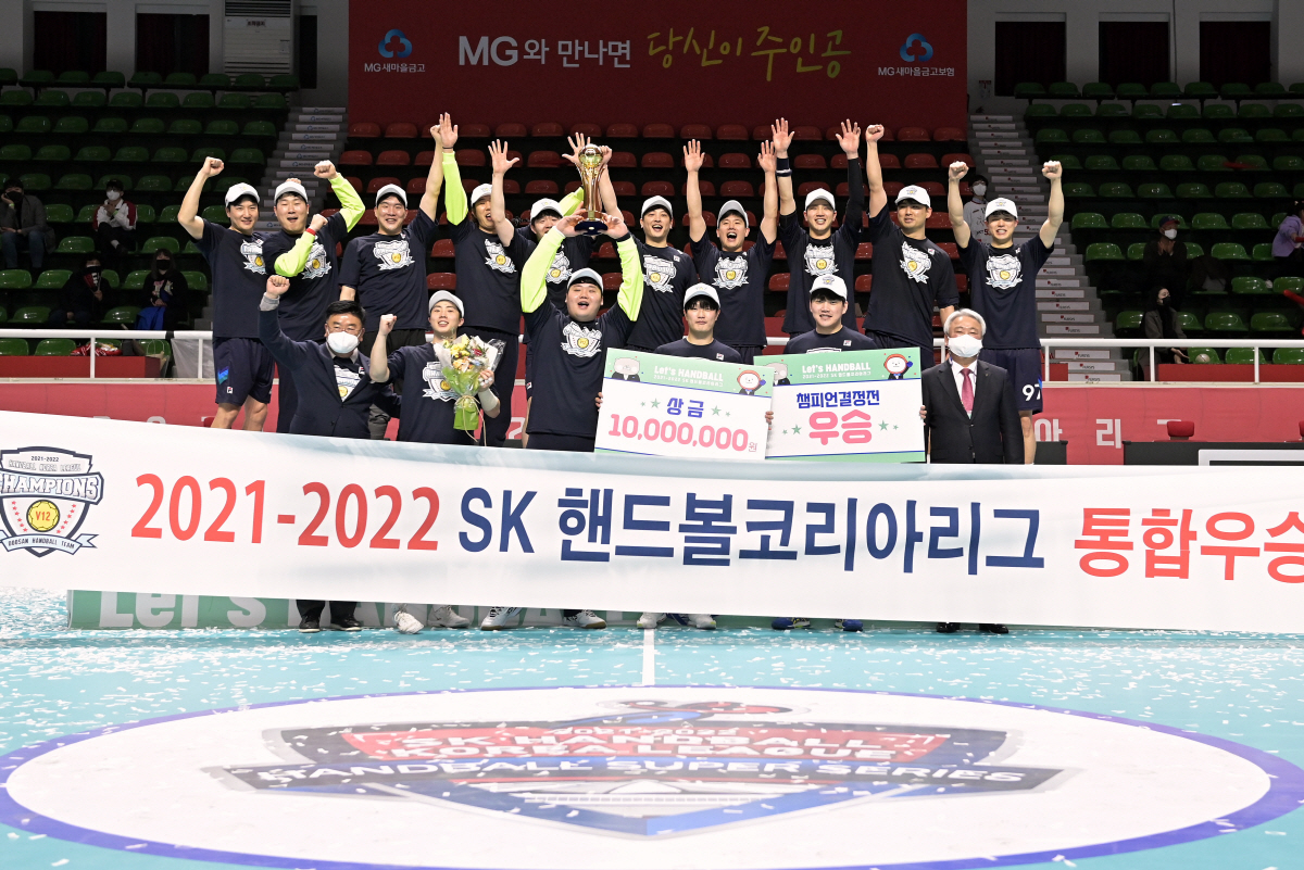 남자 핸드볼 '최강' 두산이 또 한 번 정상에 우뚝 섰다. 두산은 3월 30일 충북 청주 SK호크스 아레나에서 열린 SK호크스와의 2021~2022시즌 SK핸드볼 코리아리그 챔피언결정전 남자부 2차전에서 29대28로 승리했다. 이틀 전 열린 1차전에서 23대20으로 승리한 두산은 2연승을 질주하며 챔피언 자리에 올랐다. 올 시즌 정규리그 1위팀 두산은 통합 우승의 기쁨을 누렸다. 두산은 2015시즌부터 7연속 챔피언 자리를 지켰다. 또 2011년 출범한 코리아리그에서 2014시즌을 제외하고 11시즌 가운데 10번이나 우승하는 힘을 발휘했다.