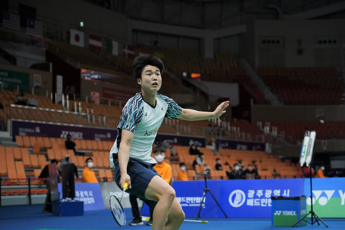 현역 국가대표 전혁진은 15일 광주여대 체육관에서 벌어진 '2022 광주 요넥스코리아마스터즈 배드민턴선수권대회(슈퍼300)' 남자단식 8강전서 대표팀 은퇴 선배 손완호를 2대0(21-3, 21-16)으로 꺾고 준결승에 올랐다.