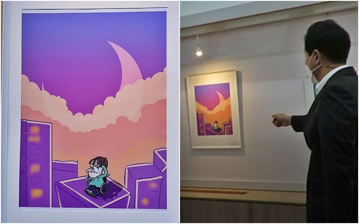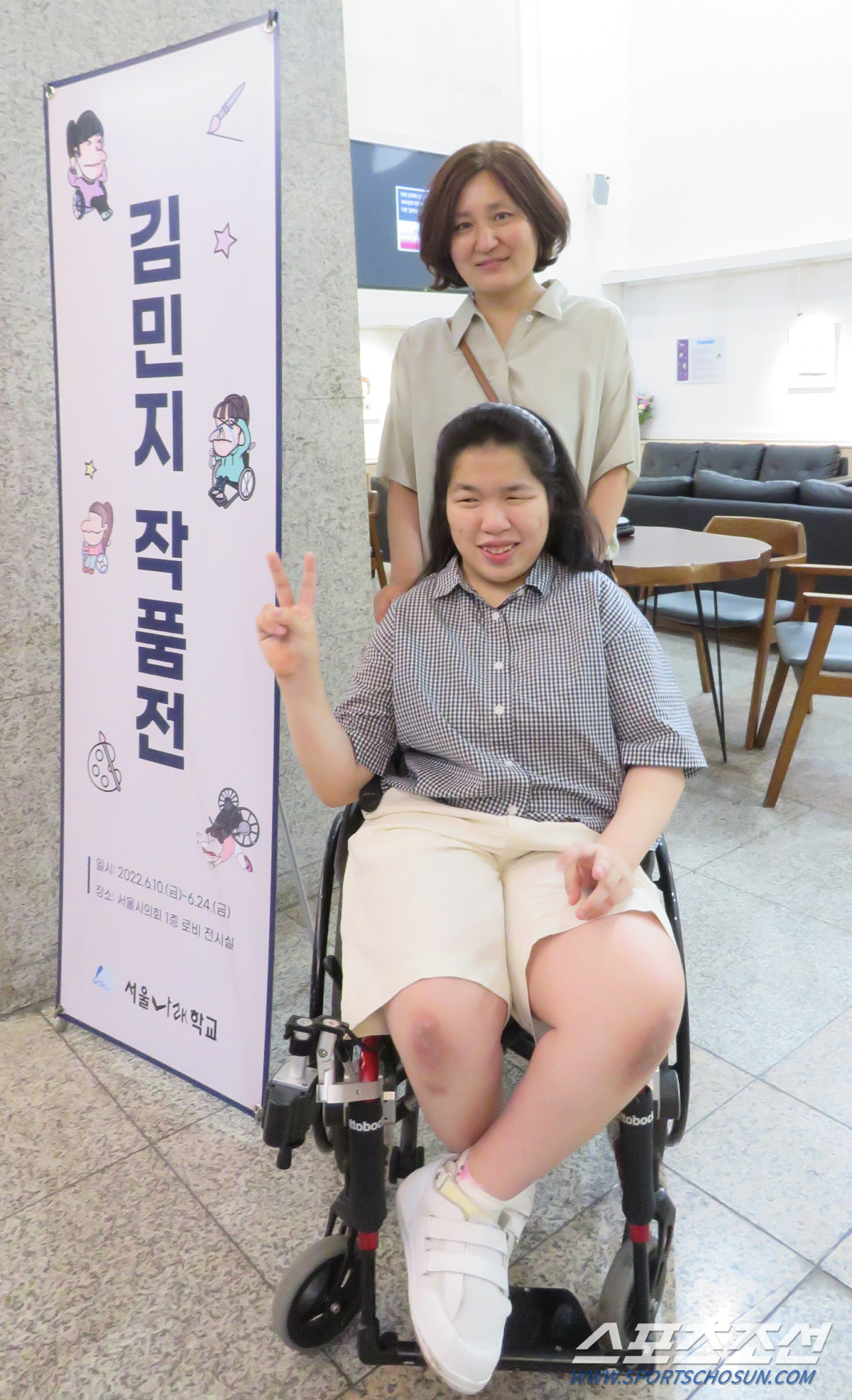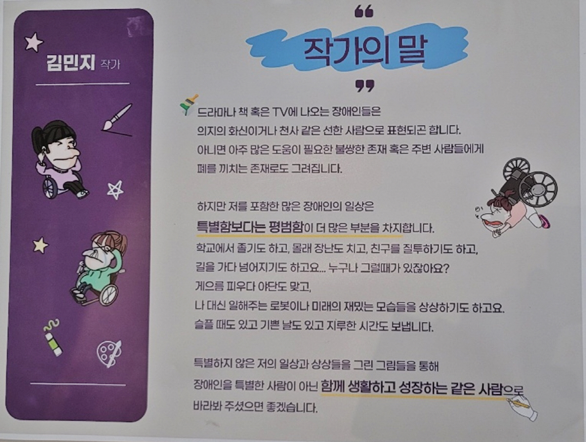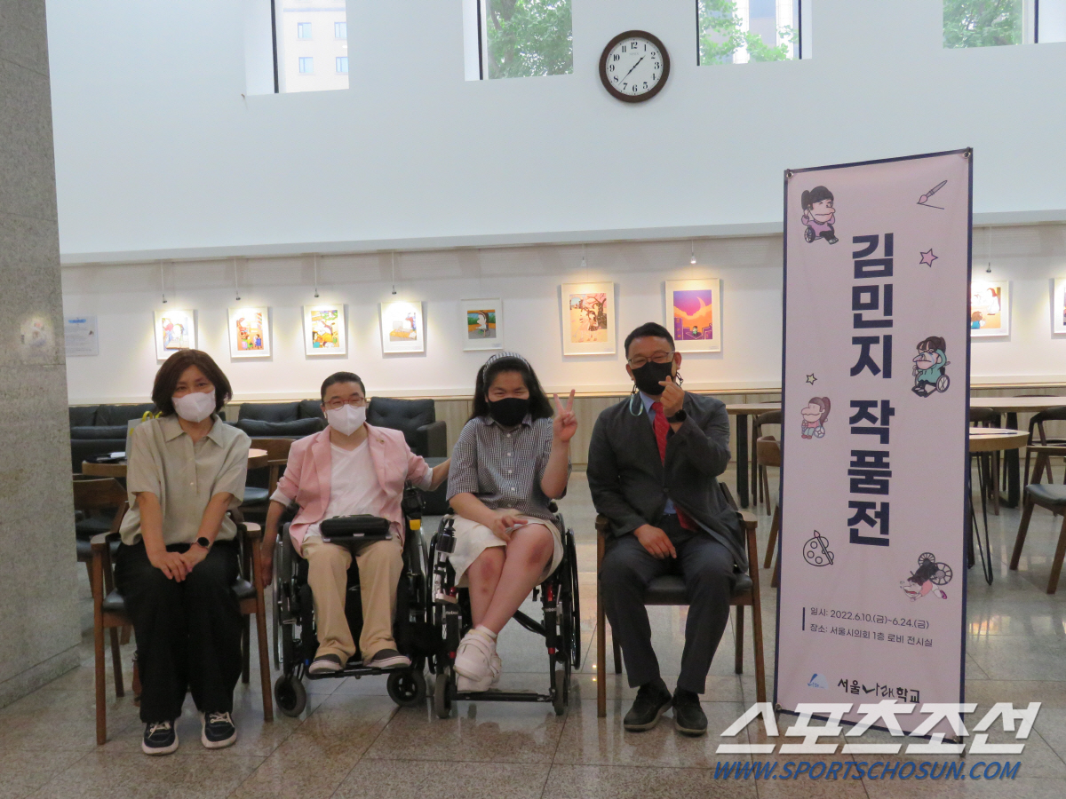 뇌병변 장애인인 김민지 작가는 서울나래학교 전공과 1회 졸업생이다. 어릴 때부터 공책에 그림을 그리며 외로운 시간을 버텼다는 김 작가는 한국장애인고용공단 '장애학생 희망 일자리' 인턴십을 거쳐 올해부터 나래학교 도서실에서 사서보조로 일하고 있다. 작품 소재는 게임을 좋아하는 사서 '휠체어 소녀'의 좌충우돌 일상이다. 도서관에서 아이들에게 책 읽어주다 꾸벅꾸벅 조는 그림도, 로봇이 내 일 좀 대신해줬으면 하는 소망을 담은 '나 대신 로봇'도 공감백배다. 만원 지하철 문앞에서 절박하게 뭔가를 외치는 작품 제목은 '나도 타야 해요', 휠체어에서 우당탕탕 넘어진 그림 밑엔 '아이쿠'란 제목을 달았다. 김 작가는 지난 4월 장애인의 날엔 서울특별시교육청에서 전시회를 가졌고, 2개월만인 이날 서울시의회에서 의미 있는 작품전을 열었다. '김민지 작품전'을 마련한 김 의원은 "시의원 4년 임기를 끝내며 의미 있는 전시를 하게 됐다"면서 "장애 예술인 꿈나무들이 이런 기회를 통해서 격려받고 더 큰 꿈을 꾸는 기회가 되길. 무엇보다 시의원, 시 직원, 공무원들이 장애인들의 일상을 담은 이 그림들을 보면서 장애를 자연스럽게 바라볼 수 있는 기회가 되길 바란다"고 했다.