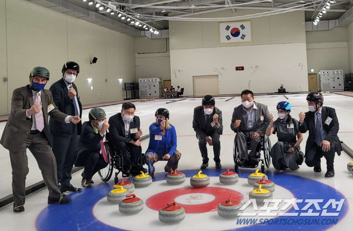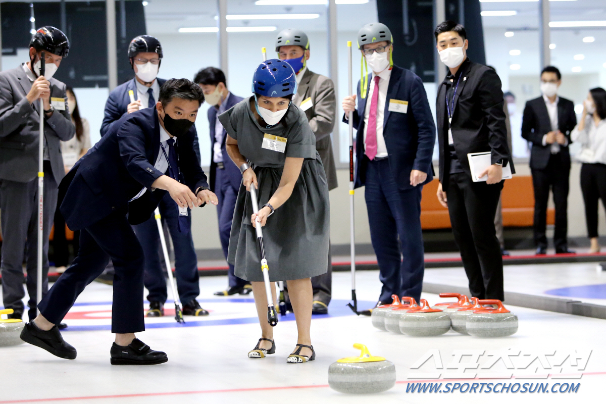 아를레타 에바 브조조프스카 폴란드 부대사가 김정훈 대한장애인컬링협회 사무국장의 안내에 따라 휠체어컬링을 체험하고 있다.