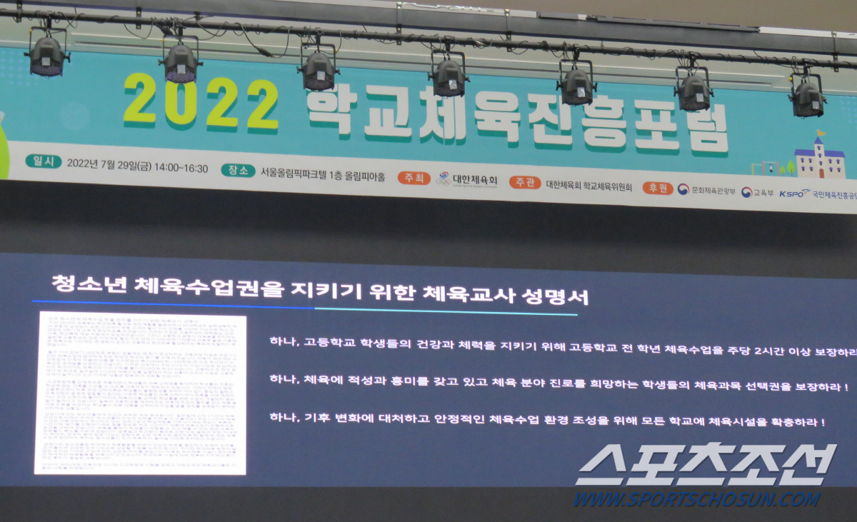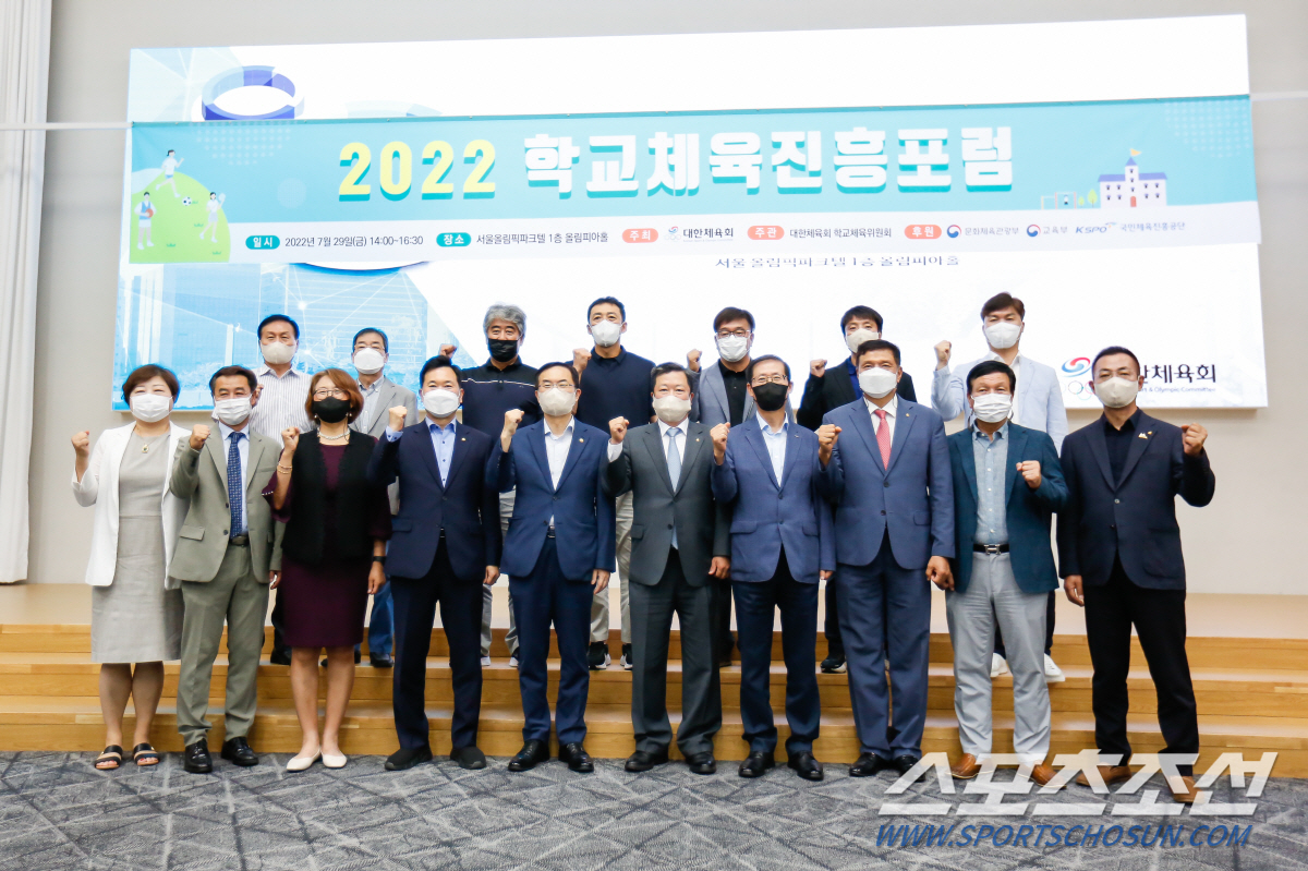 대한체육회는 29일 오후 2시 서울 송파구 올림픽파크텔 1층 올림피아홀에서 2022년 학교체육진흥포럼을 개최했다. 코로나19 이후 3년 만에 대면으로 개최된 이번 포럼은 올해 하반기 교육부의 2022년 개정 교육과정 확정 고시를 앞두고 새 정부의 학교체육 활성화에 대한 정책적 공감대가 시급하다는 현장의 위기감과 '지금이 아니면 안된다'는 절박함에서 마련됐다.