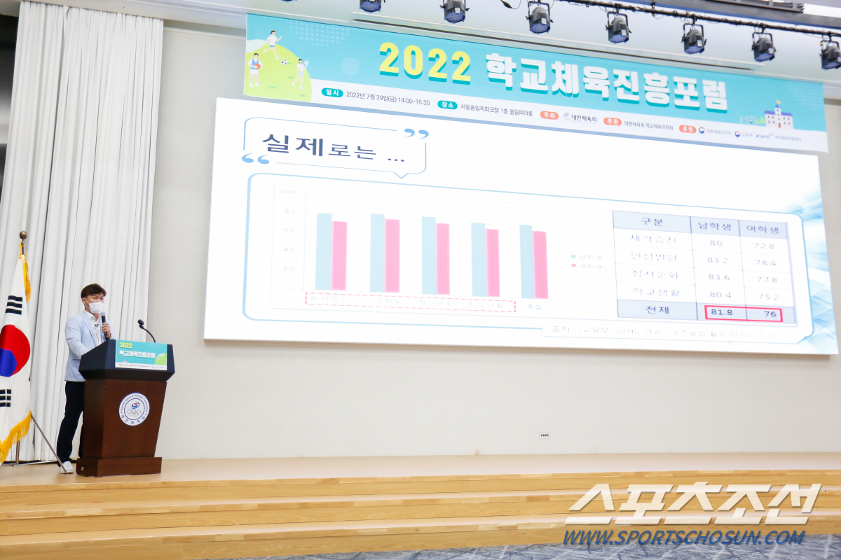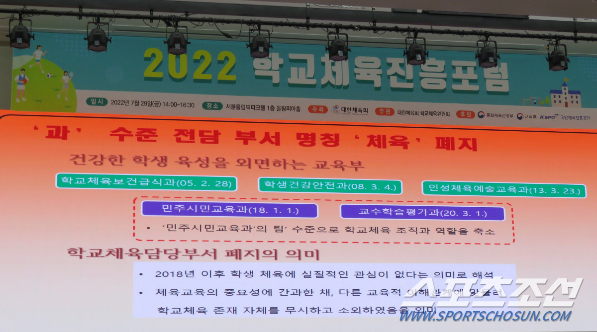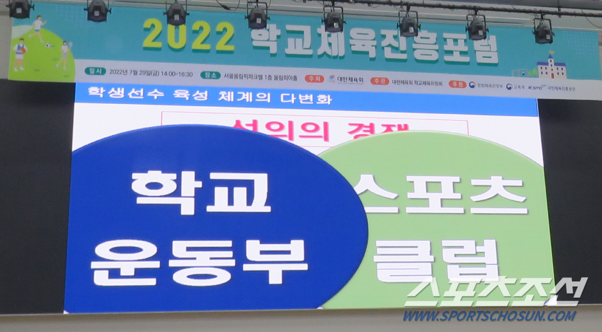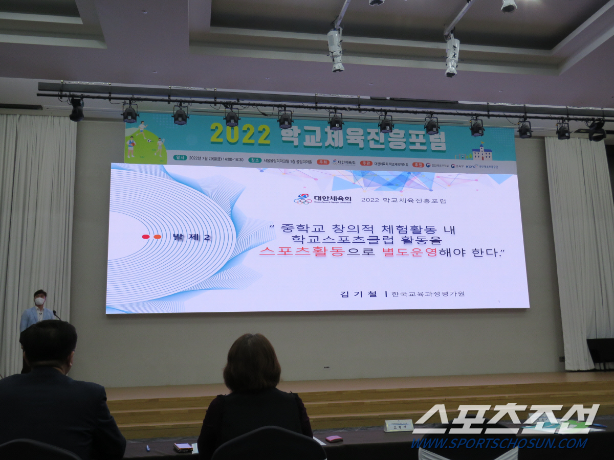 조남기 숙명여대 교수의 사회로 시작된 포럼, 김택천 대한체육회 학교체육위원장이 '학교체육정책 개선과 시행을 새 정부에 요구한다'는 주제 발표를 통해 할 말을 했다. 김 위원장은 교육부의 학교체육 예산 문제를 지적했다. 김 위원장은 "교육부는 말로만 학교체육이 중요하다고 할 뿐, 학교체육은 소외되고 홀대받아 왔다"면서 "2022년 교육부 예산은 89조 6251억원, 유아 및 초·중·등교육에 70조 7300억원의 예산이 배정됐다. 학교체육 활성화에 대한 예산은 이중 128억9150만원으로 교육부 유아, 초중등 예산의 0.018%에 불과하다"고 주장했다. "유아 및 초·중·등교육 예산의 단 1%만 배정해도 7073억원을 학교체육 활성화를 위해 쓸 수 있다"며 아쉬움을 표했다. 김 위원장은 "2018년 교육부가 학교체육 정책을 담당하는 인성체육교육과를 폐지하고 민주시민교육과의 팀 수준으로 학교체육 조직을 축소해 운영해온 사실만 봐도 학교체육에 대한 관심과 실천을 등한시한다고 볼 수 있다"고 비판했다. 김 위원장은 "국가경쟁력 제고 및 성장기 학생 개인의 정신적, 신체적, 사회적 건강을 위해 반드시 필요한 학교체육의 교육적 의무"를 재차 강조하면서 "교육부의 2022년 개정교육과정과 학교운동부 운영과 관련한 체육교육 정책 개선의 필요성"을 강력히 제기했다.