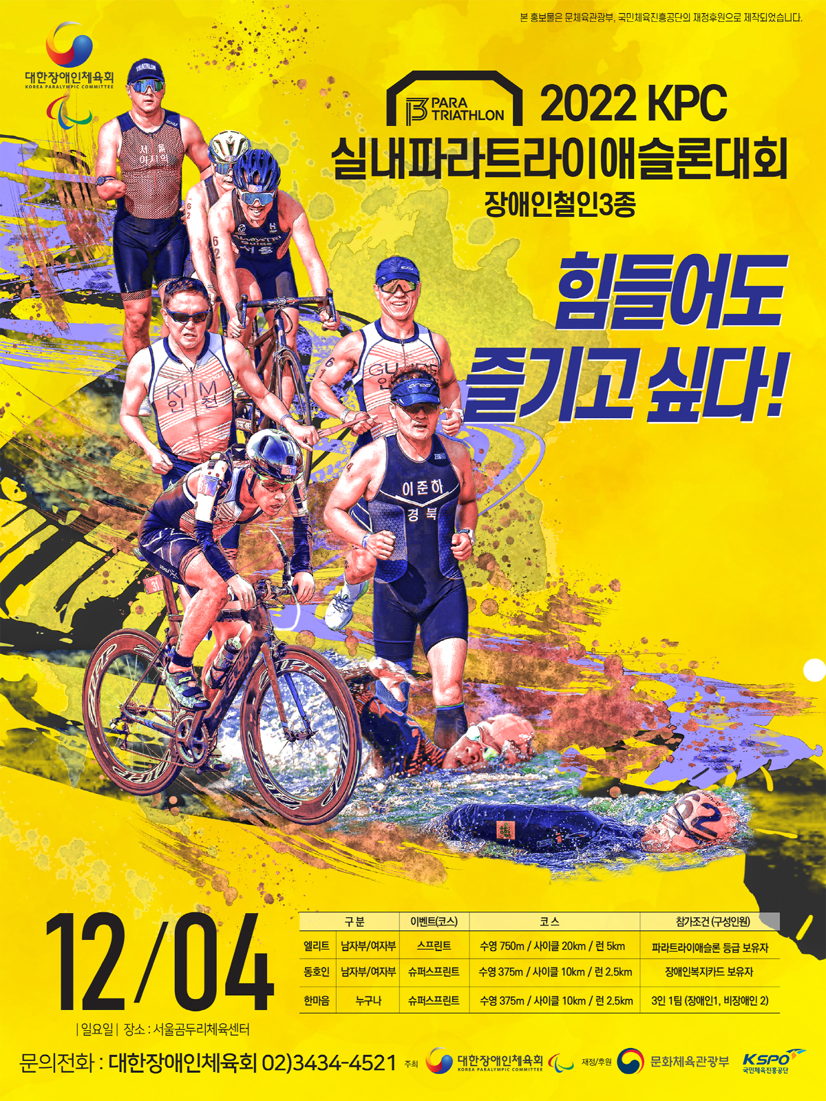 ○…올해로 3회째를 맞이하는 '2022 KPC 실내 파라트라이애슬론대회'가 12월 4일 서울 곰두리체육센터에서 개최된다. 이번 대회에는 총 60여명의 선수단이 참가하며, 엘리트 및 동호인부와 장애인과 비장애인이 함께 하는 한마음 경기가 펼쳐진다. 엘리트 및 동호인부는 개인전으로 진행되고, 한마음 경기는 비장애인 등록 선수를 제외한 장애인 및 비장애인 참가자 3인이 팀을 이뤄 실시된다. 'KPC 실내 파라트라이애슬론대회'는 종목 저변 확대와 장애 인식개선 확산을 위해 지난 2020년부터 시작됐다. 수영(실내 수영장)과 사이클(즈위프트), 달리기(무동력 러닝머신) 3개 종목 기록을 합산하여 부문별 참가자 순위가 결정된다.