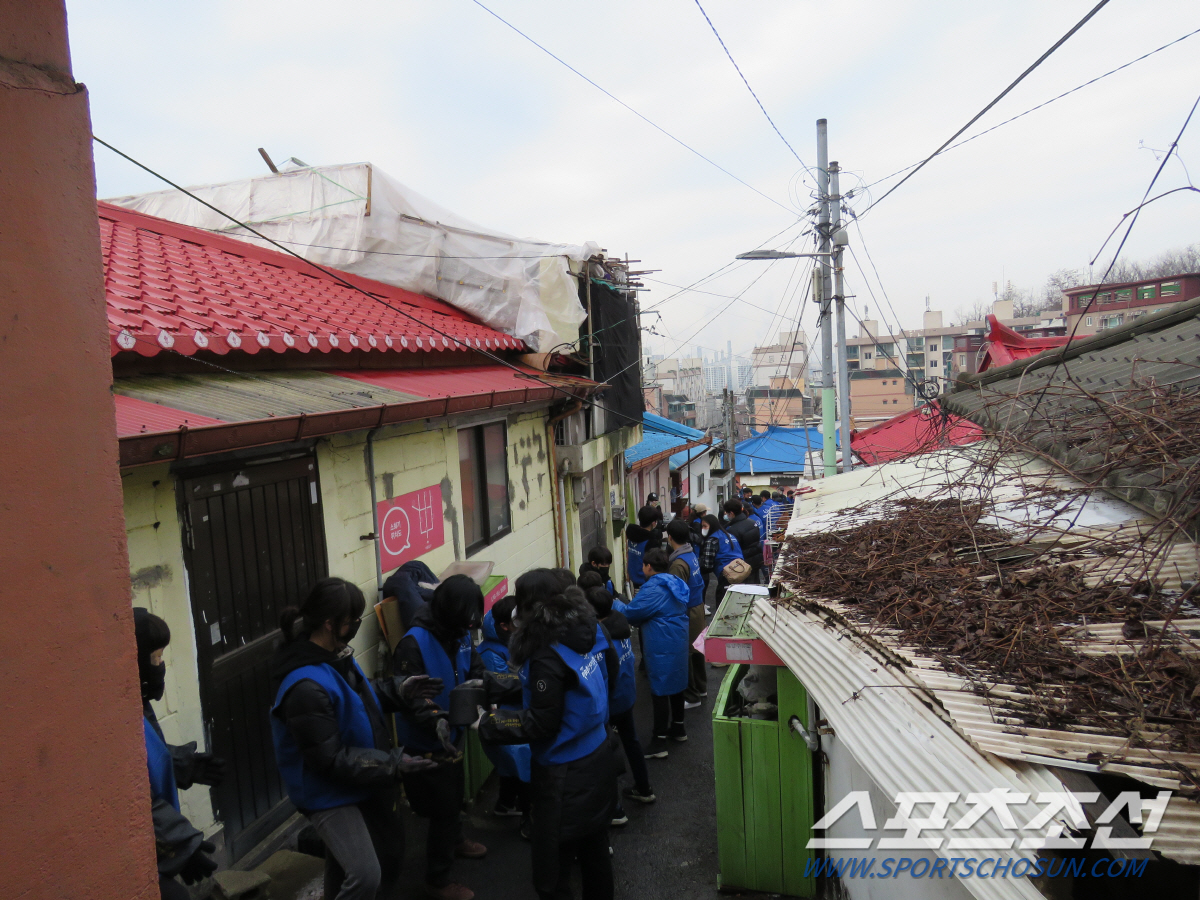첫 눈이 사뿐히 내려앉은 이른 아침, 추운 날씨에도 김장성 진흥원 이사장, 김교흥 후원회장(더불어민주당의원·인천 서구), 사무국 직원들과 함께 '박태환수영장' 소속 어린이 회원, 팬클럽 '태환전설' 팬 등 80여 명이 집결했다. '박태환 수영과학진흥원' 로고가 새겨진 푸른 조끼를 나눠입고 검은 앞치마, 장갑으로 무장하자마자 연탄 3000장 배달 미션이 시작됐다.
