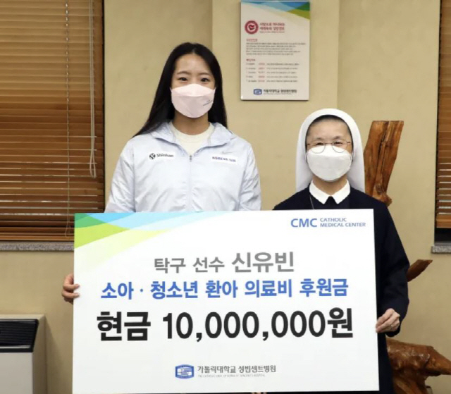 신유빈은 2년 전 대한항공에 입단해 월급을 받게 된 이후 꾸준히 기부활동을 이어왔다. 2020년 7월 첫 월급으로 600만원 상당의 운동화를 구입해 보육원에 선물했고, 한국초등탁구연맹 유소년 후배들을 위해 600만원 상당의 탁구용품을 기부했다. 또 도쿄올림픽을 앞둔 지난해 4월엔 한국여성탁구연맹을 직접 찾아 탁구 꿈나무들을 위해 써달라며 현금 500만원과 탁구용품을 전달했다. 도쿄올림픽에서 당찬 플레이로 스타덤에 오른 후 귀국한 8월 말엔 고향 수원 아주대병원의 소아 청소년 환자들을 위해 CF 수익금 8000만원을 기부했고, 지난 연말 KGC인삼공사와 후원 협약을 맺은 직후엔 후원금 전액을 유소년 스포츠 발전 및 장애인 복지 프로그램에 기부하겠다는 의사를 밝혔다. 지난해 예능프로그램 '놀면 뭐하니'를 통해 마련한 유소년 탁구선수 지원을 위한 기부금과 출연료 2000만원을 대한탁구협회에 전달했고, 아주대병원 소아청소년 환자들을 위해 광고 수익금 8000만원을 기부하기도 했다. 지난해 말엔 가톨릭대 성빈센트병원에 소아, 청소년 환자들을 위한 의료 후원금 1000만원을 기부한 바 있다.