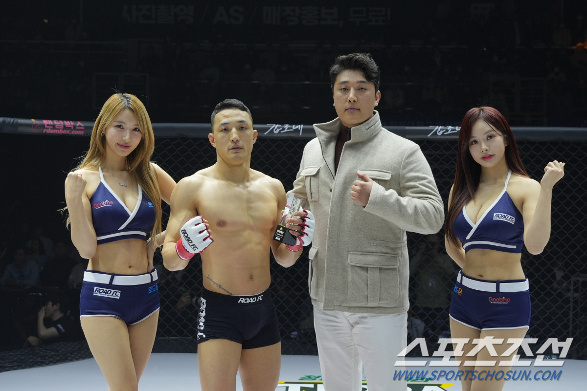 위너즈 최승정 대표가 25일 고양체육관에서 열린 굽네 ROAD FC 063 밴텀급 경기서 승리한 양지용에게 트로피를 시상하고 기념촬영을 하고 있다. 사진제공=로드FC