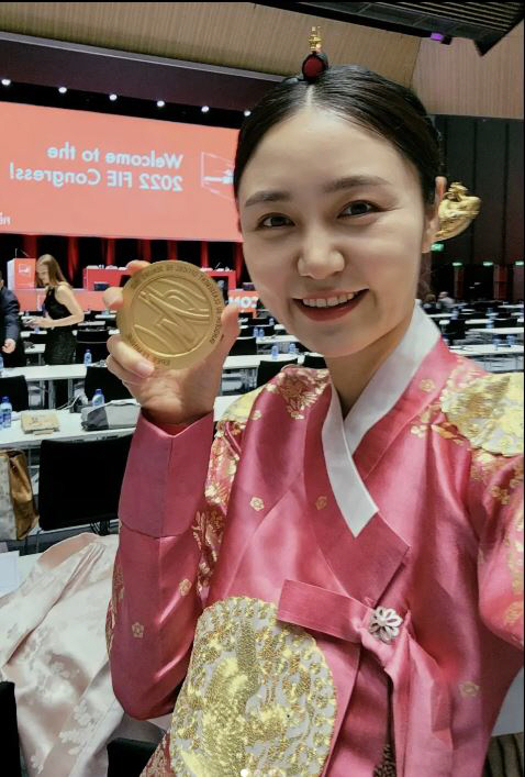 지난해 말 국제펜싱연맹(FIE)이 전세계 톱랭커들을 초대하는 명예의 전당 파티에 고운 한복 차림으로 참석한 '에페여제' 최인정.  사진출처=최인정SNS