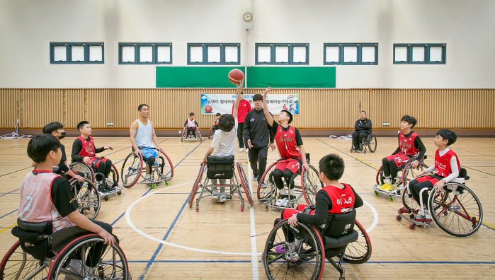 이미 우리 사회 여러 곳에서는 이런 인식을 개선하기 위한 노력이 꾸준히 이어지고 있다. 지난 1일 코웨이 휠체어농구단과 프로농구 서울 SK 나이츠의 주니어나이츠(유소년팀)와 함께 진행한 '코웨이스포츠 재능나눔 교실'도 이런 노력의 일환이었다. 지난 2022년 KWBL 휠체어농구리그 초대 우승을 차지한 코웨이 휠체어 농구단이 비장애인 어린이들에게 먼저 손을 내밀었다. SK 주니어나이츠 소속의 어린 선수들은 이 따뜻한 손을 용기 있게 움켜쥐었다. '같은 농구인'이라는 공감대 속에서 휠체어 농구를 체험하면서 자연스럽게 장애인에 대한 편견의 벽은 허물어져 갔다.