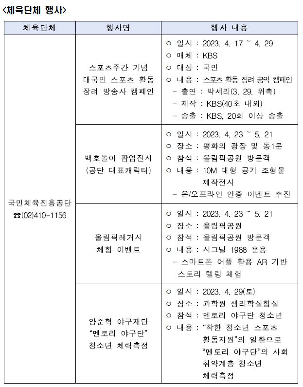 문화체육관광부( 이하 문체부)가 4월 23~29일, '스포츠로 특별한 일주일' 2023년 스포츠주간을 시행한다. 스포츠주간은 스포츠기본법에 따라 매년 4월 마지막 주간에 실시되며, 정부기관, 지방자치단체, 직장, 학교 등에서 자체 사정에 맞춰 스포츠 행사를 실시하도록 하는 주간으로, 문체부는 정부 부처, 지자체, 국민체육진흥공단, 대한체육회, 대한장애인체육회 등 체육단체와 함께