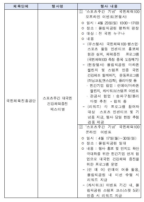 또 문체부는 국민체육진흥공단과 함께 23일부터 운동하는 국민에게 포인트를 지급하는 '스포츠활동 인센티브' 시범사업을 개시한다. 국민이 체력측정, 스포츠클럽 활동, 기타 체육시설 이용을 하면 다시 체육시설 이용과 체육용품 구매 등에 현금처럼 사용할 수 있는 포인트를 1인당 연간 5만 포인트까지 지급한다. 국민체력 100 홈페이지에서 회원가입 후 전국 75개 국민체력인증센터 등에서 체력측정 및 체력증진 교실을 이용하면 된다. 올해 새로 위촉된 홍보대사 '골프여제' 박세리 전 감독과 함께하는 '다같이 즐기는 스포츠활동 캠페인'을 시작으로, 23일 오전 10시부터 서울 올림픽공원 평화의 광장에선 국민체력100과 관련된 체력측정 종목체험, 간소화된 체력측정(헬스업) 서비스 참여자에게 포인트를 제공한다. 스포츠댄스 강좌와 스포츠용품 프리마켓도 진행된다. 올림픽공원 일원에선 30일까지 런데이(앱), 캐시워크(앱) 등 민간업체와 협업으로 달리기와 걷기 행사도 다채롭게 펼쳐진다.