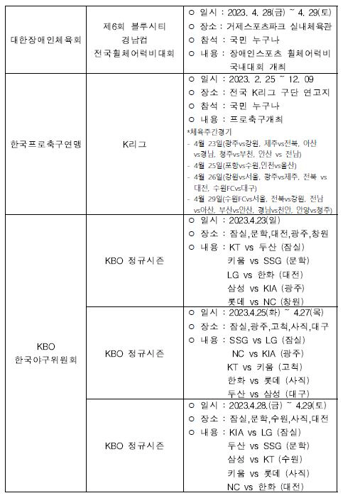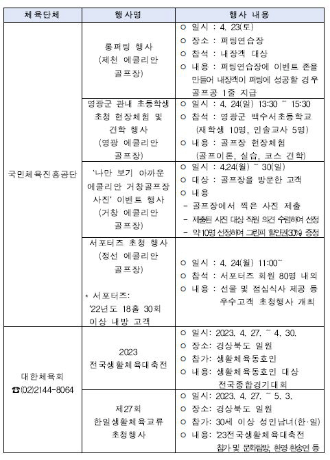 코로나19 확산으로 취소되거나 축소 운영되었던 체육대회와 스포츠 행사들이 재개된다. 4월 27~30일 겅북 구미를 중심으로 '2023 전국생활체육대축전'이 열린다. 43개 종목의 생활체육동호회 선수·임원 등 2만여 명과 관람객 6만여 명이 함께한다. 특히 올해는 일본 생활체육인 128명도 함께해 한일 생활체육 교류를 다시 시작한다.