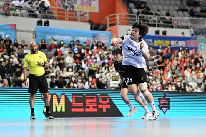 후반도 비슷한 양상으로 전개됐다. 쫓고 쫓기는 모습이 반복됐다. 팽팽한 균형이 깨진 것은 후반 17분이었다. 삼척시청이 김보은의 속공과 김민서의 7m 던지기로 23-21, 역전에 성공했다. 다급해진 부산시설공단은 작전 시간을 요청해 전열을 가다듬었다.
