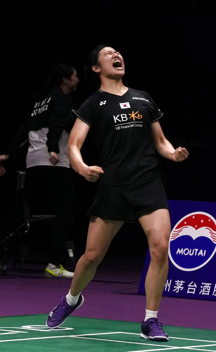 (230519) -- SUZHOU, May 19, 2023 (Xinhua) -- An Seyoung of South Korea celebrates in the women's singles match against Tai Tzu Ying of Chinese Taipei during the quarterfinal match between South Korea and Chinese Taipei at BWF Sudirman Cup in Suzhou, east China's Jiangsu Province, May 19, 2023. (Xinhua/Liu Wenhui)<저작권자(c) 연합뉴스, 무단 전재-재배포 금지>