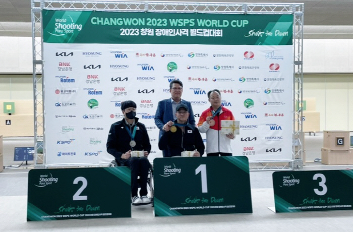 문상필 대한장애인사격연맹 회장(맨 뒤)이 25일 창원 국제사격장에서 열린 '2023 창원장애인사격월드컵' 남자 10m 공기소총 결승에서 금메달과 은메달을 따낸 박진호(가운데 아래)와 이장호(맨 왼쪽)에게 메달을 수여한 뒤 기념촬영을 하고 있다. 창원=스포츠조선 이원만 기자wman@sportschosun.com