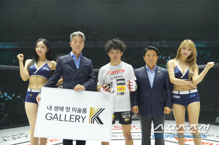 갤러리K 김정필 의장(왼쪽)과 원제용 도의원이 24일 원주종합체육관에서 열린 ROAD FC 064 -63㎏ 밴텀급 토너먼트 8강전서 승리한 일본의 하라구치 아키라에게 트로피를 시상하고 기념촬영을 하고 있다. 사진제공=로드FC