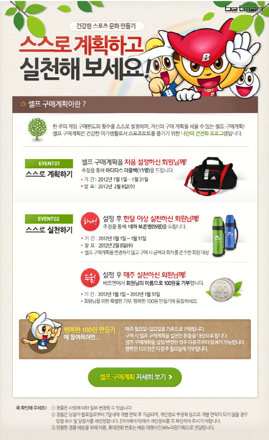 이와 동시에 셀프구매계획을 설정한 후 한달 이상 구매금액과 횟수를 정확히 준수한 회원들에게는 추첨을 통해 네파 보온병(15명)을 제공한다. 이밖에 한 주 동안 셀프구매계획을 준수하면 회원의 이름으로 100원의 기부금을 적립, 어려운 이웃에게 전달하는 '행복한 100원 만들기' 캠페인에도 자동으로 참여할 수 있는 기회가 주어진다.
