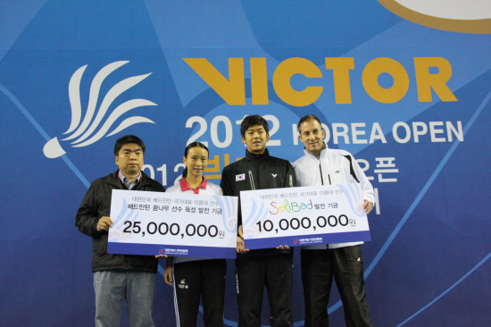 이용대는 5일 '2012 빅터코리아오픈 슈퍼시리즈 프리미어'가 열리는 서울 SK올림픽핸드볼경기장에서 한국초등학교배드민턴연맹에 꿈나무 육성 발전기금 2500만원을 기부했다.