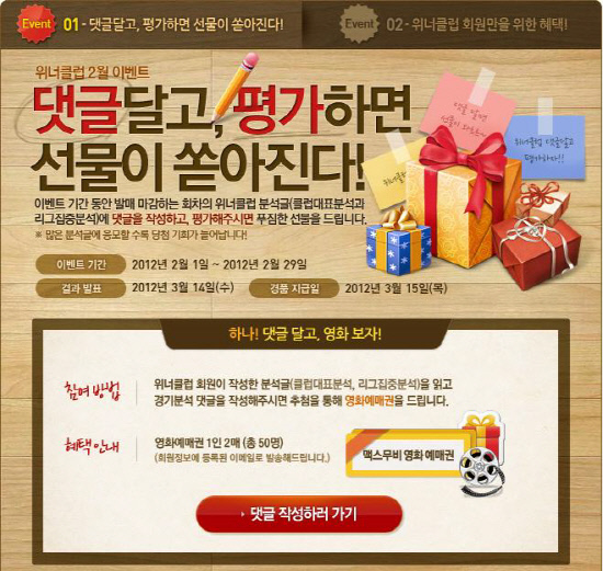 위너클럽 2월 이벤트는 29일까지 위너클럽(베트맨 회원들로 구성된 소규모 분석가 클럽이 작성한 분석글을 제공하는 서비스) 분석글을 읽고 경기분석 댓글을 작성하면 추첨을 통해 영화예매권을 드리는 방식으로 진행된다.