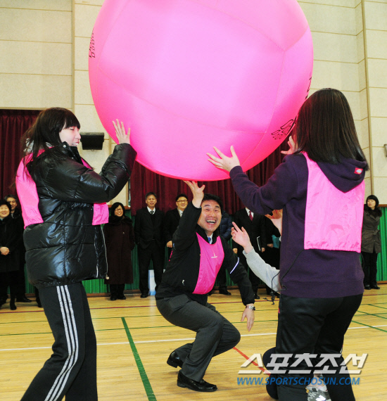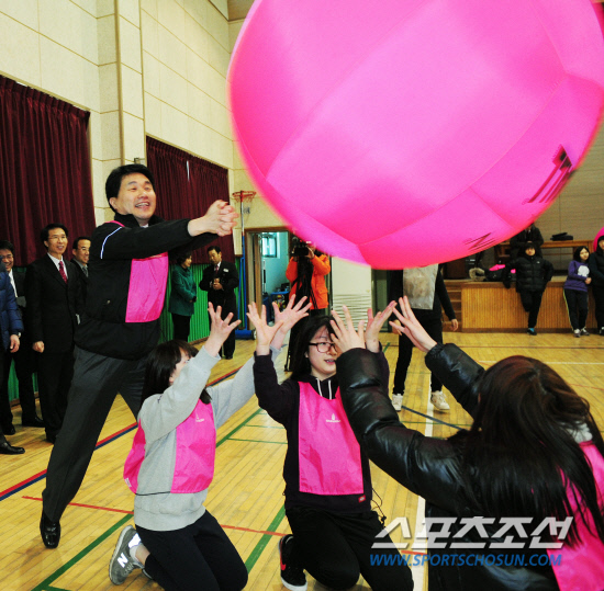 학교체육-이주호 교육과학기술부 장관이 3일 서울 선유중학교를 방문해 여학생들과 함께 킨볼 경기를 했다. 몸 사리지 않는 플레이로 큰 박수를 받았다. 2012.2.3.정재근 기자 cjg@sportschosun.com