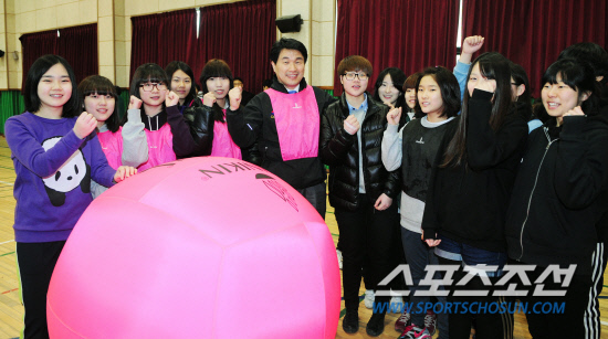 학교체육-이주호 교육과학기술부 장관이 3일 서울 선유중학교를 방문해 여학생들과 함께 킨볼 경기를 했다. 경기 후 이 장관이 학생들과 기념촬영을 하고 있다. 2012.2.3.정재근 기자 cjg@sportschosun.com