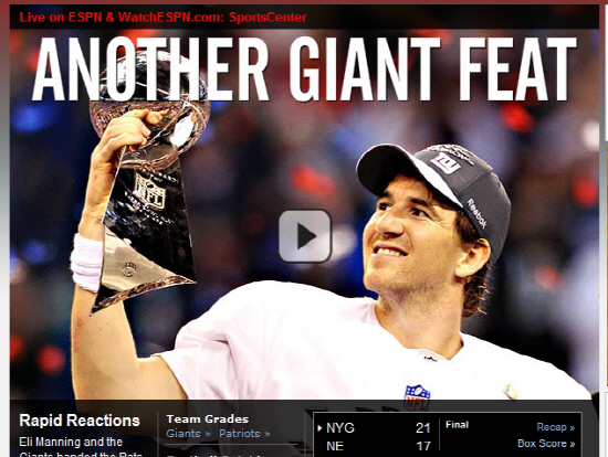 일라이는 6일(한국시각) 둘째 형의 안방인 인디애나주 인디애나폴리스 루카스오일스타디움에 섰다. 무대는 미국프로풋볼(NFL) 결승전인 제46회 슈퍼볼이었다.