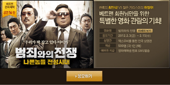 영화 '범죄와의 전쟁'은 범죄와의 전쟁이 선포된 1980년대 부산에서 벌어진 남자들의 세계를 그린 작품이다. 최민식, 하정우가 주연을 맡았고 지난 7일 누적관객수 124만명을 넘는 등 폭발적인 인기를 모으고 있다.
