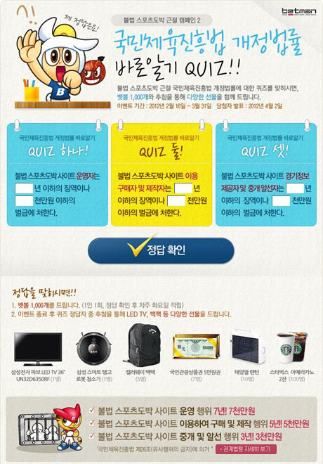 이번 이벤트에 참여하려면 베트맨 홈페이지 이벤트 화면을 방문해, 국민체육진흥법 개정과 관련한 3가지 퀴즈를 맞히면 된다. 정답을 맞힌 회원은 1일 1회에 한해 벳볼 1000개를 증정하며, 이벤트 종료 후 추첨을 통해 LED TV, 로봇 청소기 등 다양한 경품을 증정한다.