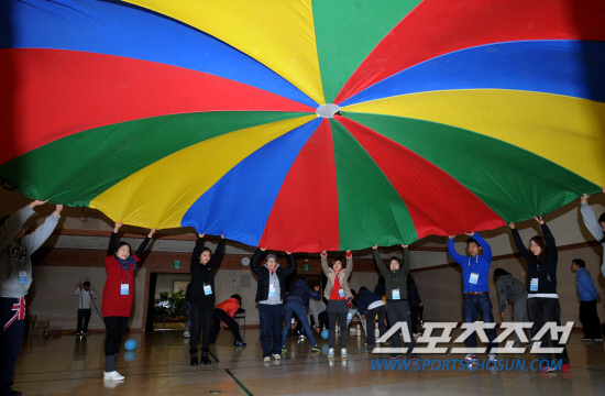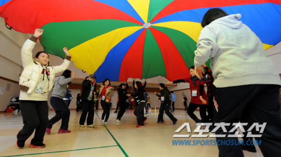 -학교체육-8일 성동구청에서 열린 어린이신체활동 교사 역량강화 교육에서 생활체육지도자들이 패러슈트를 이용한 체육활동을 체험하고 있다.허상욱 기자 wook@sportschosun.com