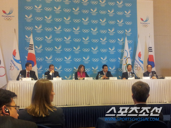 22일 평창에서 열린 3일간의 1차 조정회의를 결산하는 기자회견이 열렸다. 길버트 펠리 IOC 수석국장(왼쪽 두번째부터), 구닐라 린드버그 조정위원장, 김진선 조직위원장, 최문순 강원도지사, 박용성 대한올림픽위원회 위원장이 함께 했다. 평창=박찬준 기자