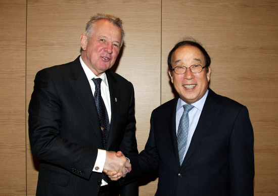 박용성 대한체육회(KOC) 회장이 핵안보정상회의에 참석한 팔 슈미트 헝가리 대통령 겸 IOC(국제올림픽위원회) 위원과 서울 소공동 롯데호텔에서 조찬 간담회를 가졌다.