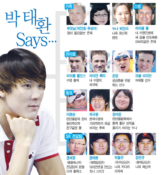 런던 2연패 프로젝트를 위해 동고동락하는 SK텔레콤 전담팀은 박태환에게 또 하나의 식구다. 호주 브리즈번 전지훈련 내내 한지붕 아래 생활한다. 함께 훈련하고, 함께 시장 보고, 함께 먹고 잔다. 이미 볼 것 안볼 것 다본 사이다. 쾌활한 성격의 권세정 SK전담팀 매니저를 '든든한 전담팀의 맏형이자 활력소'로 칭했다. 권태현 체력담당관은 박태환의 웨이트트레이닝을 전담하는 트레이너다. '나를 아이언맨으로 만들어주는 토니 스타크('아이언맨'의 본명)'라는 센스있는 정의를 내렸다. 지난 상하이세계선수권에서 이슈가 된 박태환의 농밀한 잔근육은 '권선생님'과 박태환의 치열한 결과물이다. 훈련 전후 몸과 마음, 아픈 곳을 두루 어루만져주는 박철규 의무담당관을 '나의 키다리아저씨', 낯선 호주땅에서 의사소통을 전담하는 강민규 통역담당관을 '나의 메신저'로 칭하며 감사를 표했다. 지난 2월 박태환의 단국대 학위수여식에서 SK전담팀 선생님들은 만년필을 선물로 건넸다. 대학원에 진학한 박태환에게 "열심히 공부해서 훌륭한 교수가 돼라"는 의미를 담았다.