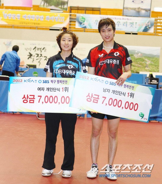 ◇2일 2012년 KRA컵 SBS탁구챔피언전 남녀단식 우승자인 대우증권 송마음(왼쪽)과 정영식이 시상식 후 나란히 서서 포즈를 취했다. 사진제공=월간탁구 안성호 기자