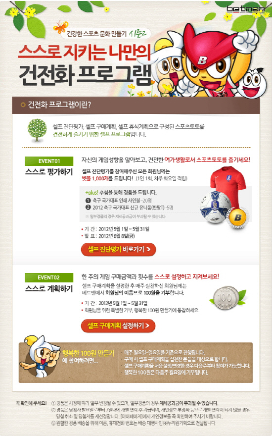 이번 캠페인 기간 동안 셀프진단평가에 참여한 모든 회원들에게는 벳볼 1000개를 적립해주고 추첨을 통해 축구 국가대표 인쇄 사인볼(20명)과 2012년 축구 국가대표 신규 유니폼(5명)을 나눠준다.