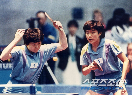 | 1991년 지바 세계탁구 선수권 대회에서 호흡을 맞추던 리분희(왼쪽)와 현정화. 스포츠조선DB |