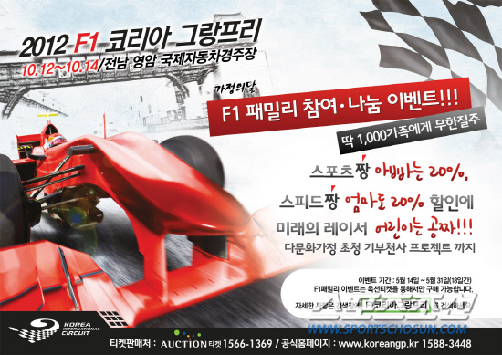 F1 코리아 그랑프리 조직위원회는 가정의 달을 맞아 가족단위 관람객을 대상으로 티켓 '2+1' 행사와 함께 다문화가정을 초청하는 '패밀리 참여-나눔 이벤트'를 14일부터 5월말까지 실시한다.