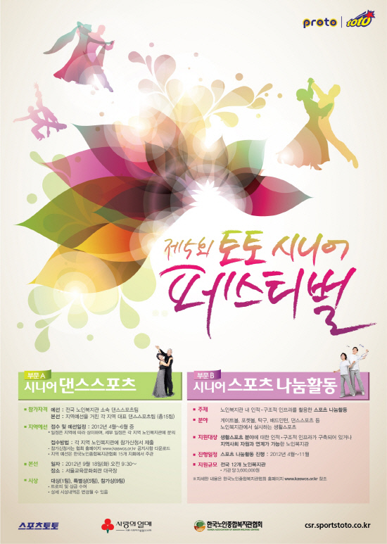 국민체육진흥공단(www.kspo.or.kr)이 발행하는 체육진흥투표권 수탁사업자인 스포츠토토(www.sportstoto.co.kr)와 서울사회복지공동모금회가 공동 주최하고 한국노인종합복지관협회가 주관하는 어르신들의 축제한마당 '제 5회 토토시니어 페스티벌'에 대한 본격적인 참여 열기가 뜨겁다.