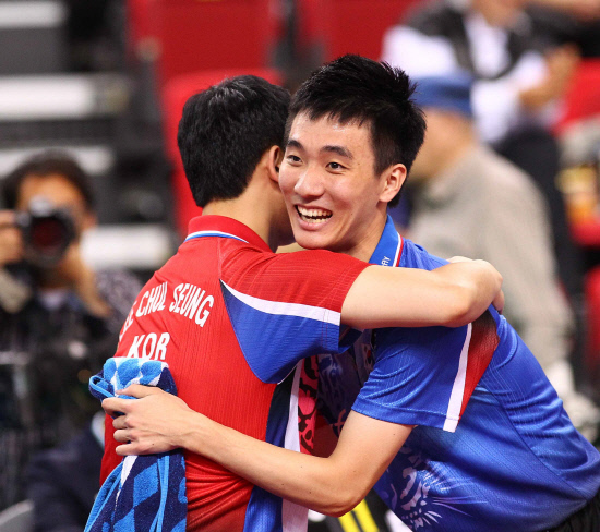 ◇한국마사회컵 코리아오픈에서 세계 1위 마롱을 꺾은 이상수가 이철승 남자대표팀 코치 겸 소속팀 삼성생명 코치와 포옹하며 기쁨을 나누고 있다. 사진제공=월간탁구 안성호 기자