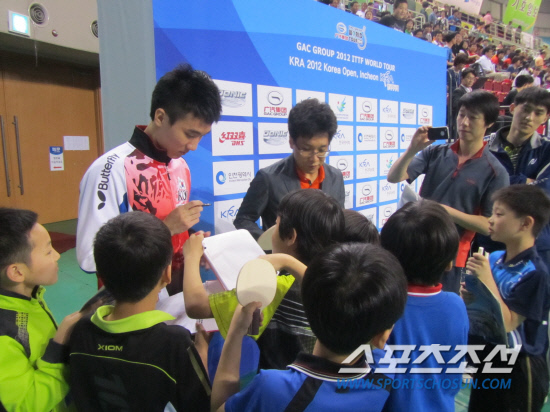 세계 챔피언 마롱을 꺾은 이상수, 이날만큼은 박지성, 김연아도 부럽잖은 최고의 스타였다. 경기를 마치고 나오는 이상수를 향해 꼬마 탁구팬 수십명이 일시에 몰려들었다. '친절한 상수씨'가 뜨거운 사인공세에 환한 미소로 응했다. 인천=전영지 기자 sky4us@sportschosun.com