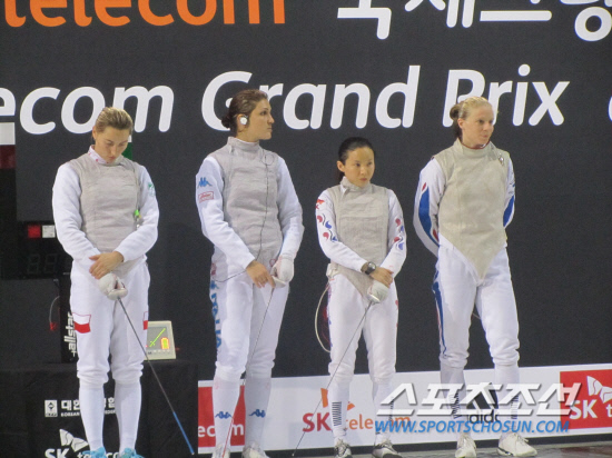 ◇SK텔레콤 국제그랑프리 플뢰레 펜싱선수권 여자부 4강에 오른 선수들이 포즈를 취했다. 왼쪽부터 이번대회 우승자인 폴란드의 실비아 그루찰라, 세계 2위 '이탈리아 에이스' 아리아나 에리고, 남현희 , 상하이월드컵 우승자 아스트리드 구야르. 1m70을 훌쩍 넘어서는 유럽 롱다리 선수들 틈에서 '땅콩 검객' 남현희의 당찬 존재감이 빛났다.