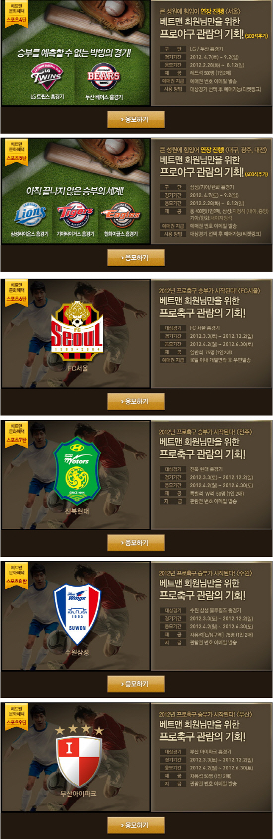 또 오늘 6월 30일까지 진행되는 베트맨 문화혜택 스포츠 '2012년 K-리그 예매권 증정' 이벤트도 함께 진행된다. 벳볼 100개 이상을 보유한 회원은 누구나 참여할 수 있으며, 당첨된 회원에게는 12월 2일까지 열리는 FC서울(일반석 75명), 전북현대(특별석 W석 50명), 수원삼성(자유석 E/N 구역 75명), 부산아이파크(자유석 50명)의 경기 중 자신이 응원하는 팀의 홈 경기를 관람할 수 있는 티켓(1인 2매)이 증정된다.
