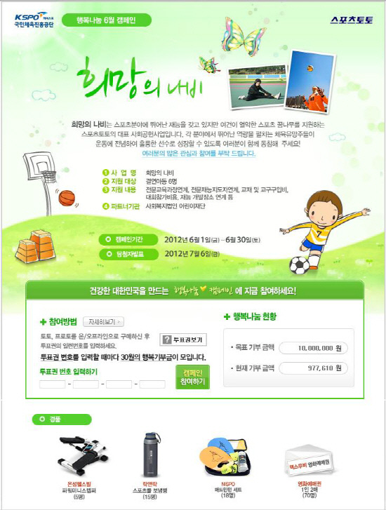 국민체육진흥공단(www.kspo.or.kr)이 발행하는 체육진흥투표권 수탁사업자인 스포츠토토(www.sportstoto.co.kr)가 진행하는 '행복나눔 6월 캠페인'을 실시한다.
