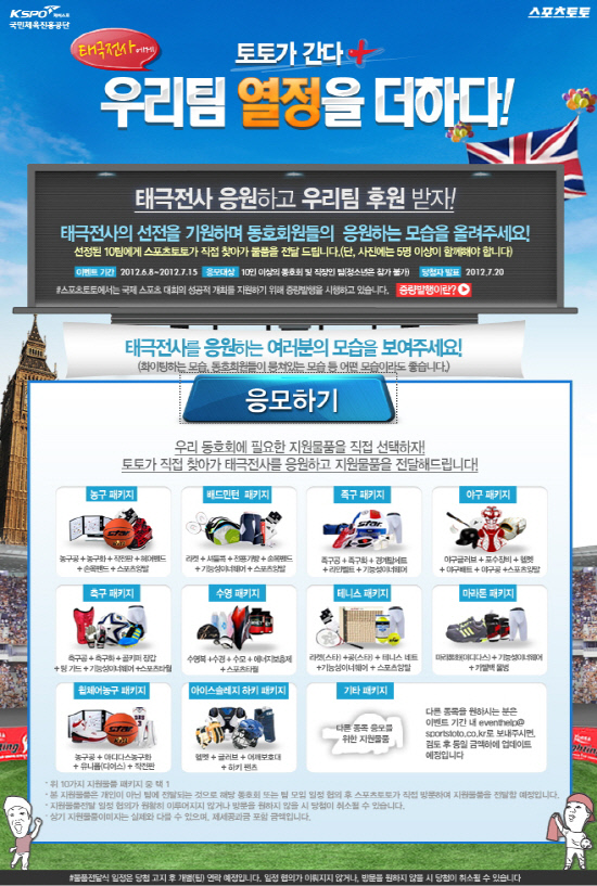 국민체육진흥공단(www.kspo.or.kr)이 발행하는 체육진흥투표권 수탁사업자인 스포츠토토(www.sportstoto.co.kr)는 태극전사들의 선전을 기원하는 마음을 담아 '토토가 간다, 우리팀 열정을 더하다' 이벤트를 진행하고 있다.