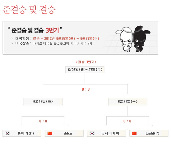 19일에는 울아가(P)와 ddcg, 21일에는 동서비지머와 Light(P)가 준결승을 겨룰 예정이다. 경기는 오후 8시 타이젬 홈페이지(www.tygem.com)에서 관람하실 수 있다.