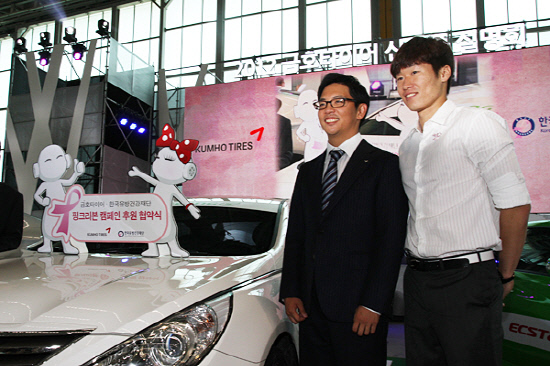 박지성은 이날 박세창 금호타이어 영업총괄 부사장과 함께 한국유방건강재단의 후원 협약식에 참석한 것.
