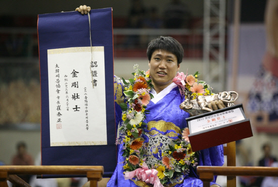 | ◇황재원이 2012년 청양단오장사씨름대회 금강장사결정전에서 생애 첫 금강장사에 올랐다. 사진제공=대한씨름협회 |