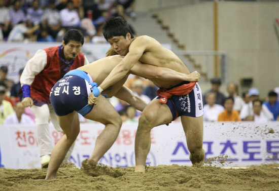 | ◇2012 청양단오장사씨름대회 금강장사결정전에서 임태혁(왼쪽)과 황재원이 치열한 경기를 펼치고 있다. 사진제공=대한씨름협회 |