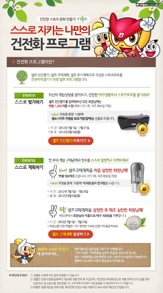 이번 캠페인 기간 동안 셀프진단평가에 참여한 모든 회원들에게는 벳볼 1000개를 적립해주고 추첨을 통해 샘소나이트 여행용 보조가방(15명)을 나눠준다.